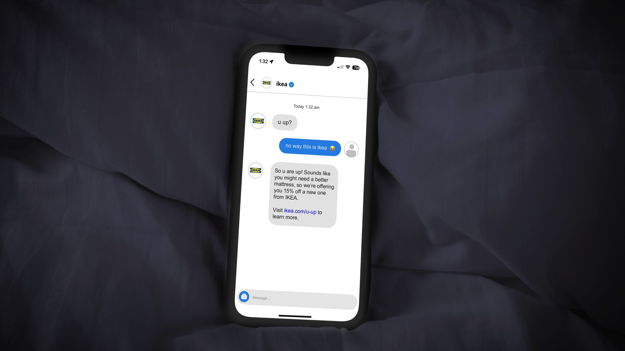 늦은 밤, 이케아는 충성 고객들에게 자니?(U Up?) 이라는 문자를 보내서 답 문자를 보내는 고객들에게 매트리스를 할인해주는 링크를 제공했다. 주로 사람들이 잠자리에 들기 40분전에 침대에서 핸드폰을 하는 것으로 조사 되었기 때문에 잠 못드는 사람들에게 도움이 되는 매트리스를 선전하는 기발한 광고가 기획되었다. |