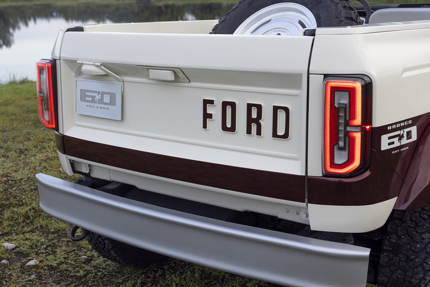 Original design elements are carefully woven into the exterior. The folding tailgate with embossed FORD logo, chrome-style classic bumpers, and Fifteen52 Analog wheels reinterpret 1960s sensibilities through modern proportions and balance.